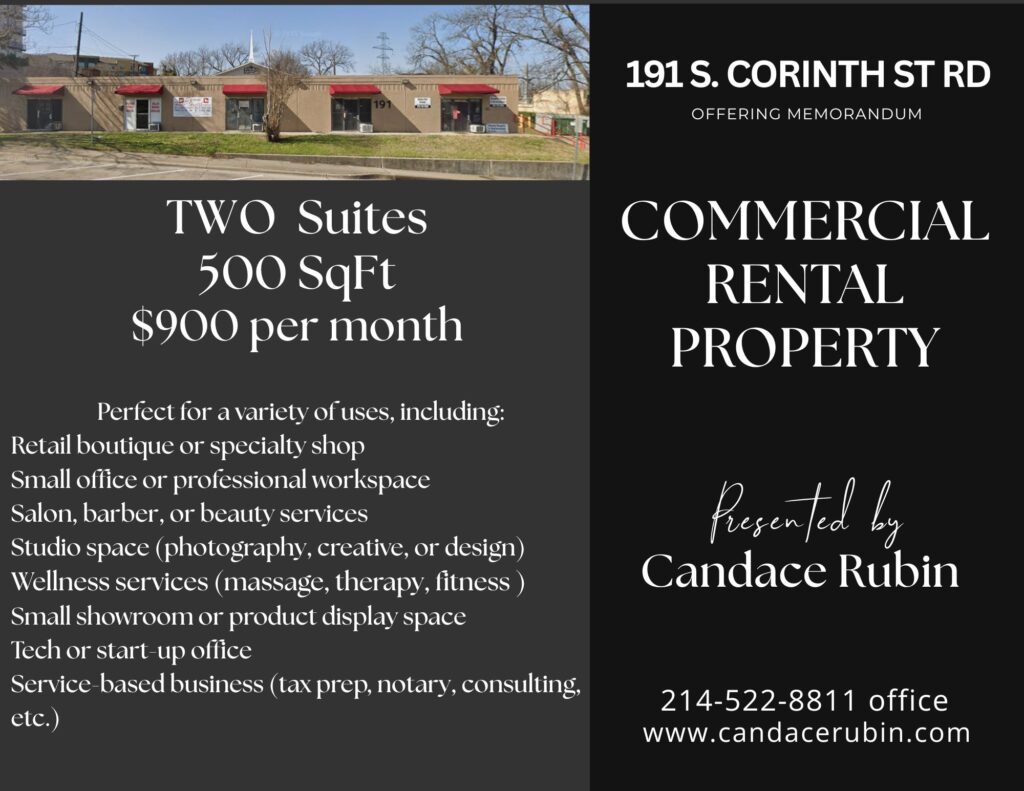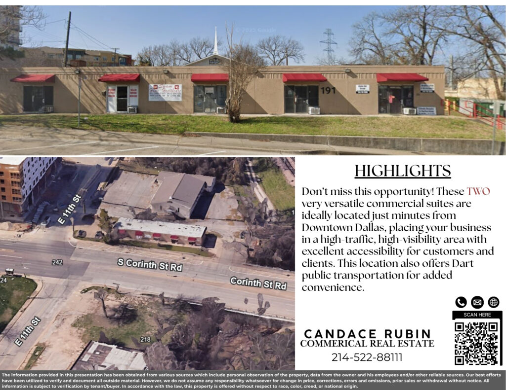Don’t miss this opportunity! These TWO very versatile commercial suites are ideally located just minutes from Downtown Dallas, placing your business in a high-traffic, high-visibility area with excellent accessibility for customers and clients. This location also offers Dart public transportation for added convenience.